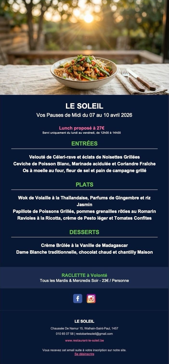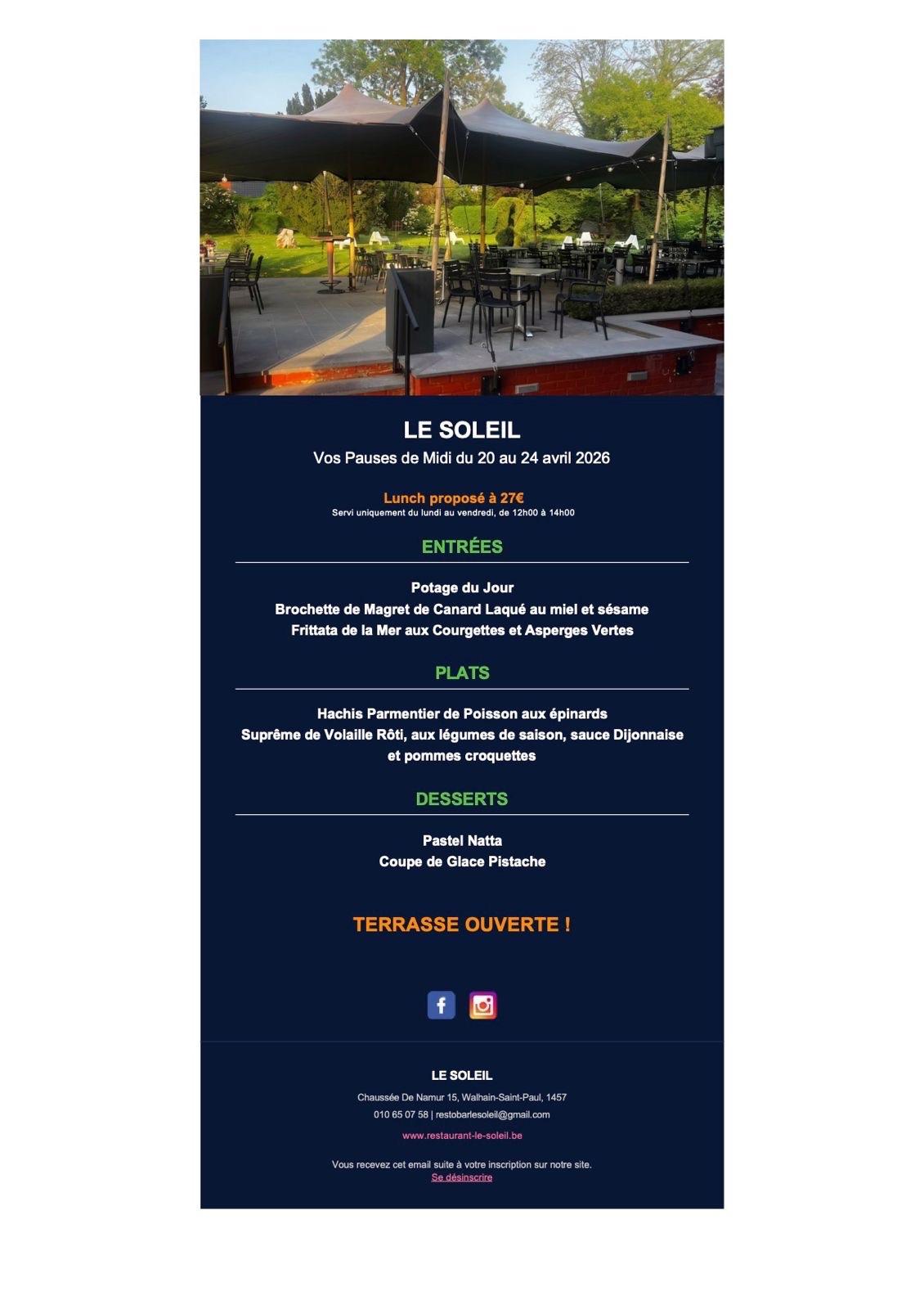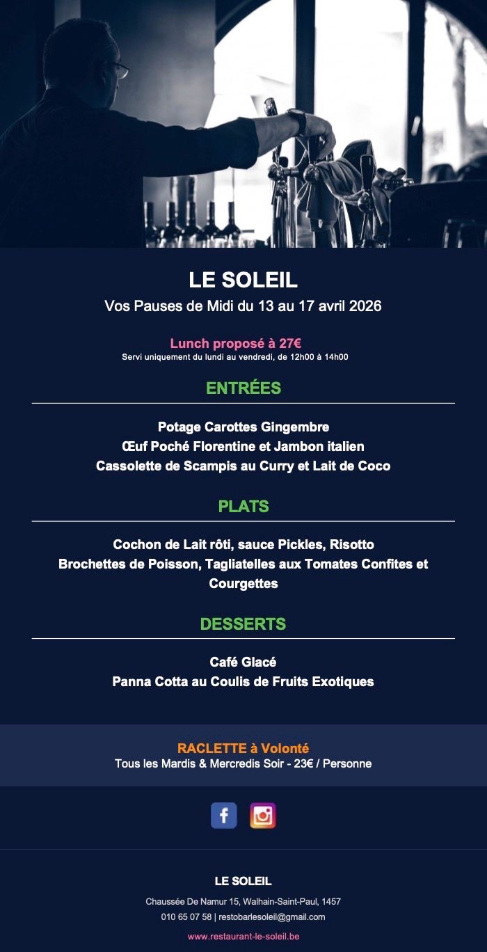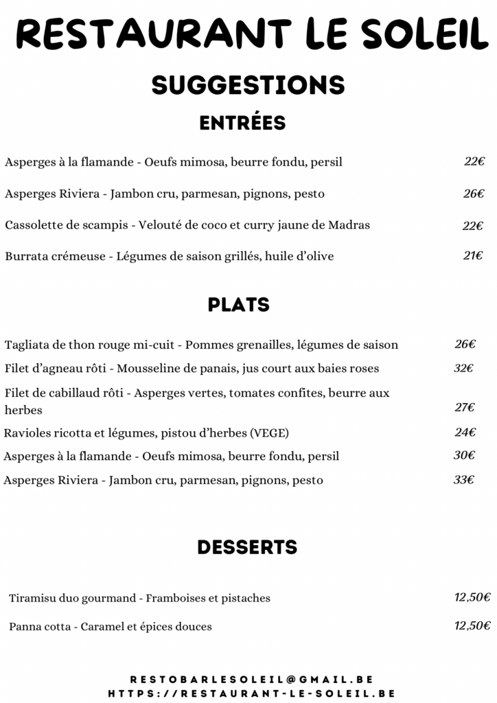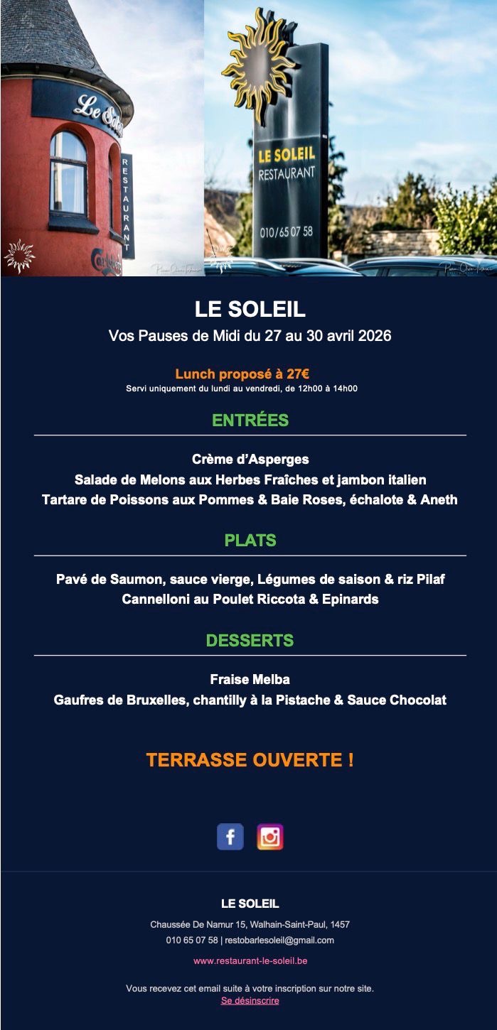 Par téléphone au +32 10 65 07 58 – Par E-mail : restobarlesoleil@gmail.com – Via le formulaire ci-dessous :